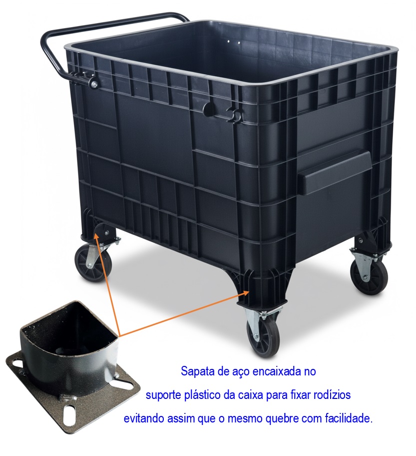 Na dianteira 2 rodízios giratórios e traseira sapata fixa